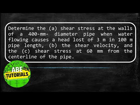 Determine the (a) shear stress at the walls of a 400-mm- diameter pipe when water flowing causes a head lost of 3 m in 100 m pipe length, (b) the shear velocity, and the (c) shear stress at 60 mm from the centerline of the pipe.